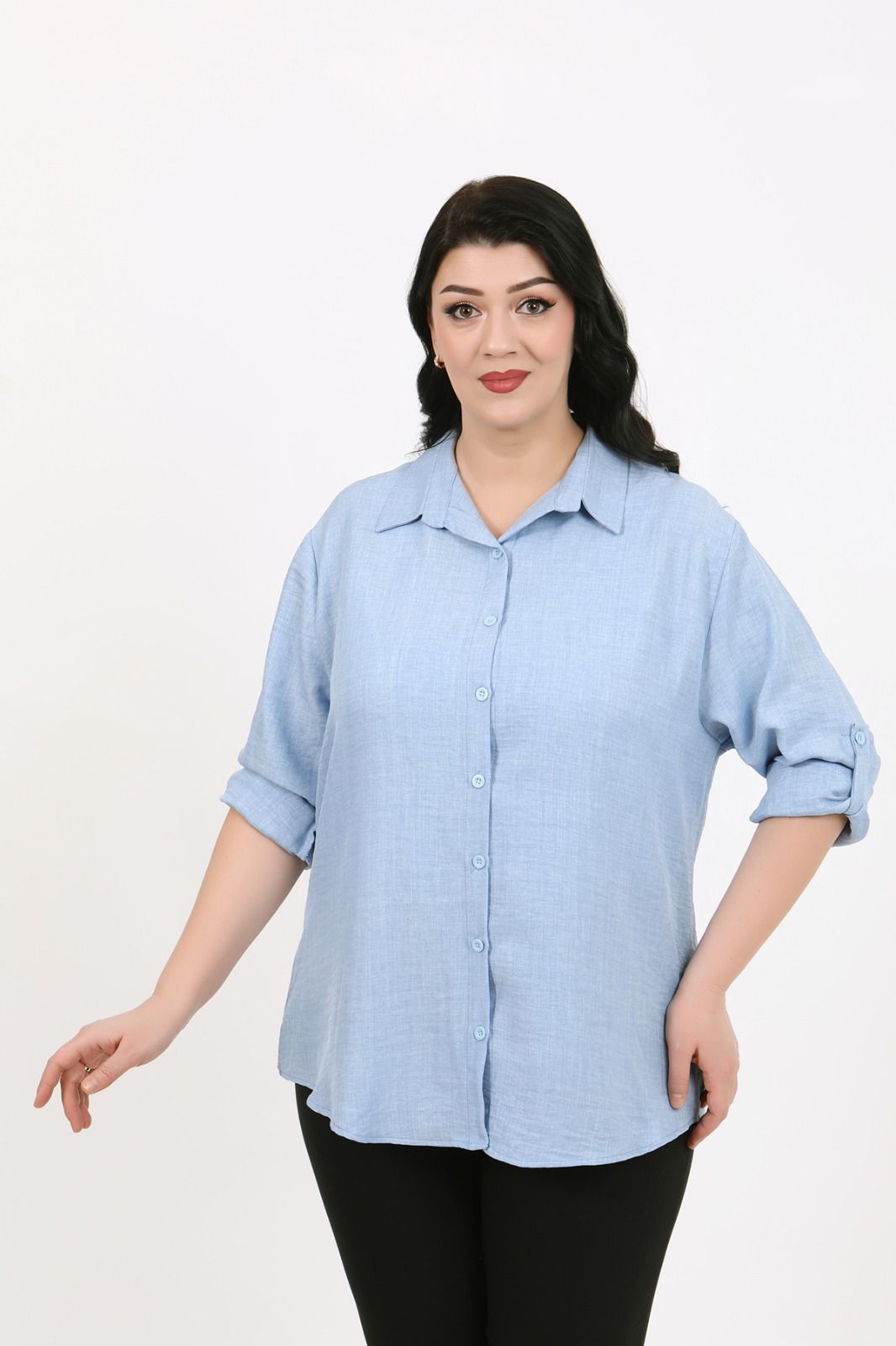 Bu gömlek, büyük beden giyen kadınların ihtiyaçlarını göz önünde bulundurarak tasarlanmıştır. Kaliteli dokusu ve geniş beden seçeneği ile vücudu sararken, rahat bir oturuş sağlar. Açık mavi rengi ise, hem dinlendirici hem de etkileyici bir görünüm oluşturur.