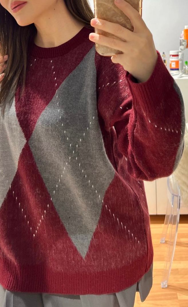 Bordo ve gri renklerin mükemmel bir uyumunu sunan bu kazak, her yaş ve tarz için uygun bir seçimdir. Düz renklerin sıkıcı görünümünden sıkılmış olanlar için, baklava desenli örgü dokusuyla farklı bir hava katar. Böylece hem şık hem de dikkat çekici bir görünüm elde edebilirsiniz.