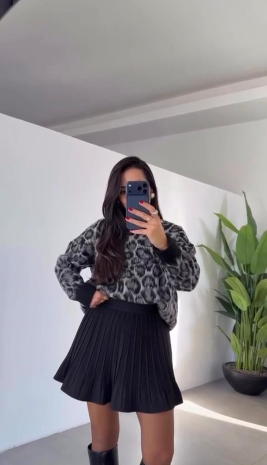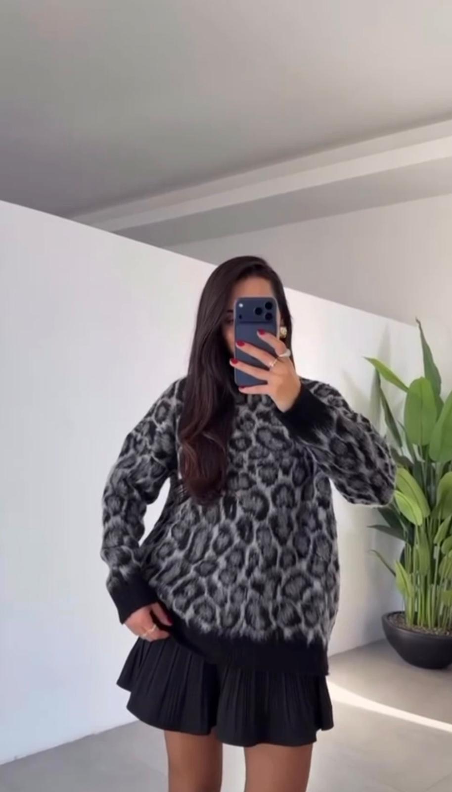 Leopar Desen Siyah Standart Beden Oversize Kazak