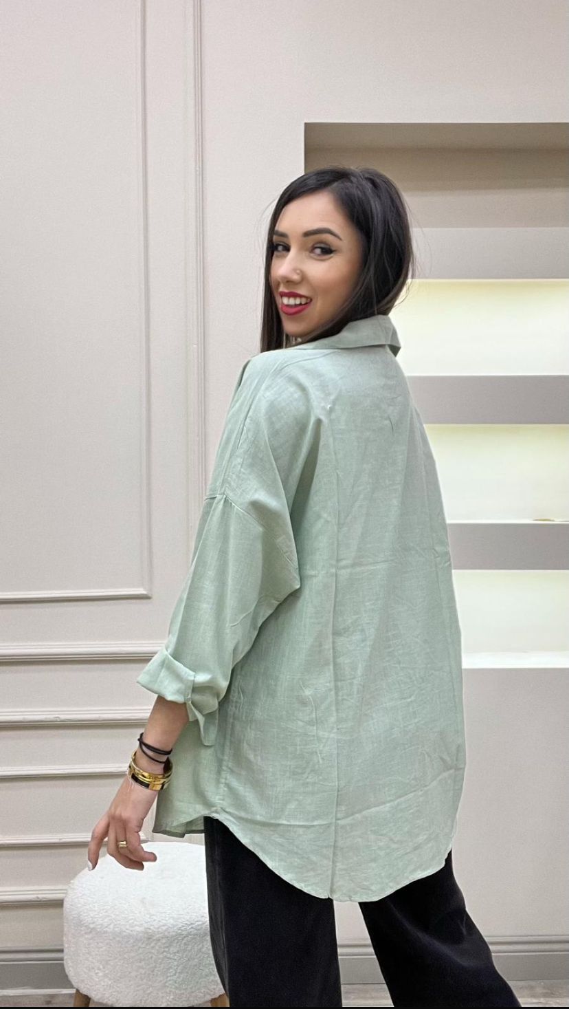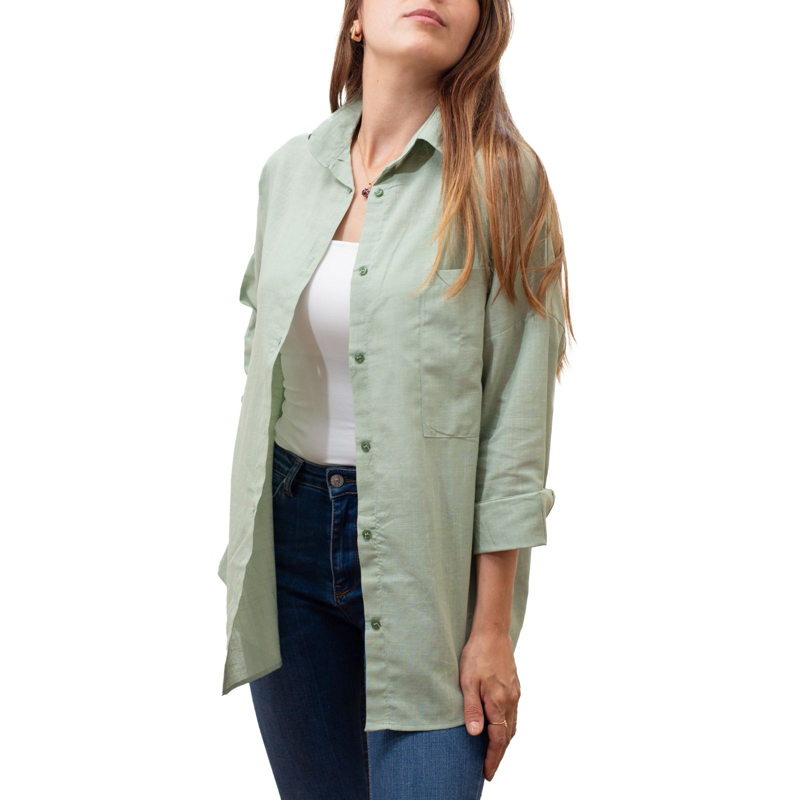 Oversize Uzun Keten Gömlek - Yeşil