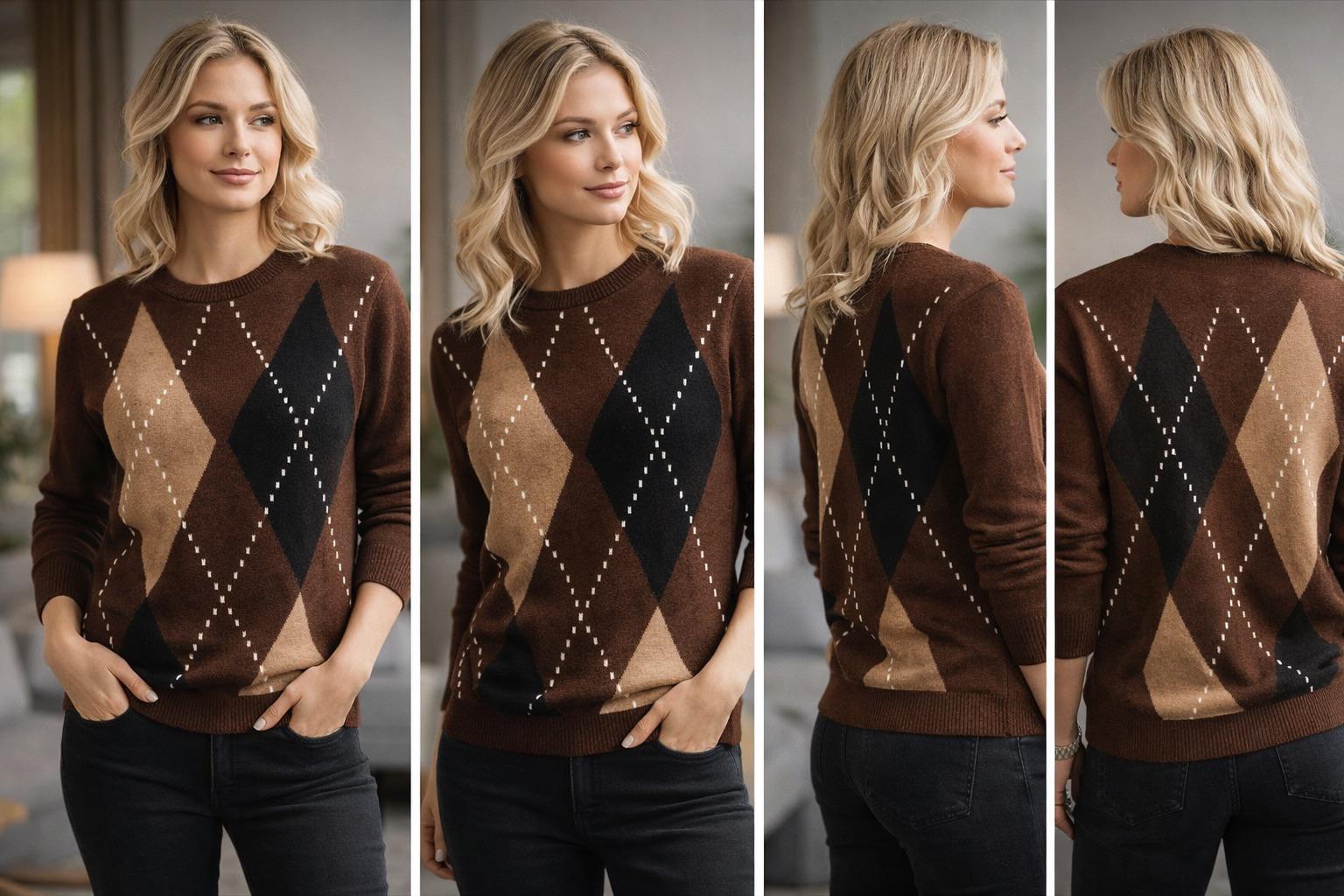 Oversize baklava desen kazak, skinny jean pantolonlar ve botlar ile mükemmel bir uyum yakalayarak şık bir günlük görünüm elde etmenizi sağlar. Üstelik, eteklerle yapacağınız kombinlerde de şıklığınızı artıran bir parça olarak öne çıkar. Aksesuarlarla zenginleştirilmiş bir görünüm; büyük küpeler, şık bir omuz çantası ve minimal takılar ile tamamlanabilir.