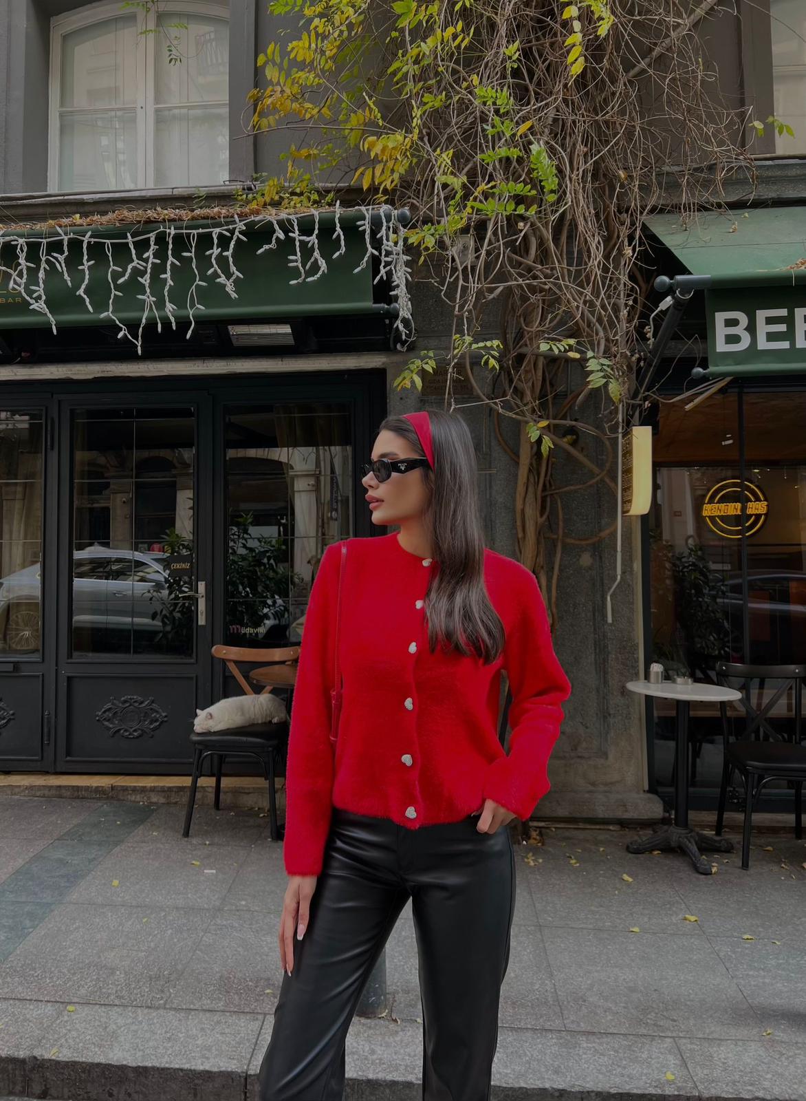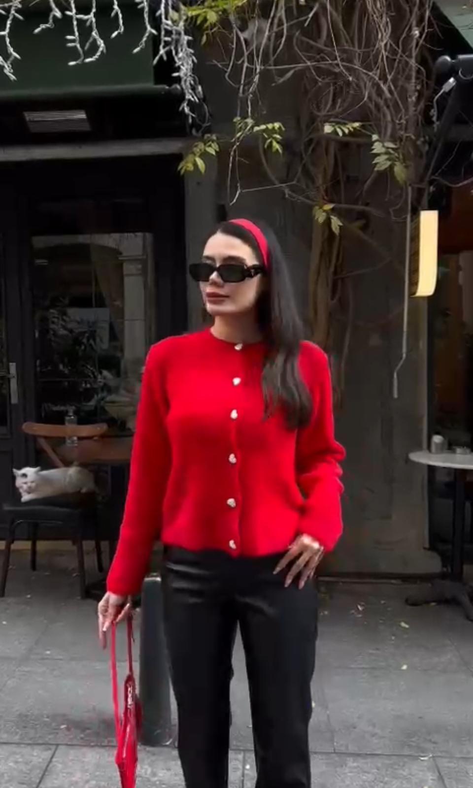 Yumuşak, kalp düğmeli standart beden kırmızı hırka, cesur rengi ve modern tasarımıyla dikkatleri üzerine çekerken, konforlu yapısıyla da sizi kendine hayran bırakacak. Hem kaliteli yapısıyla hem de şık görünümüyle her kadının gardırobunda yer alması gereken bir ürün! Şimdi hemen sipariş verin ve tarzınıza renk katın!