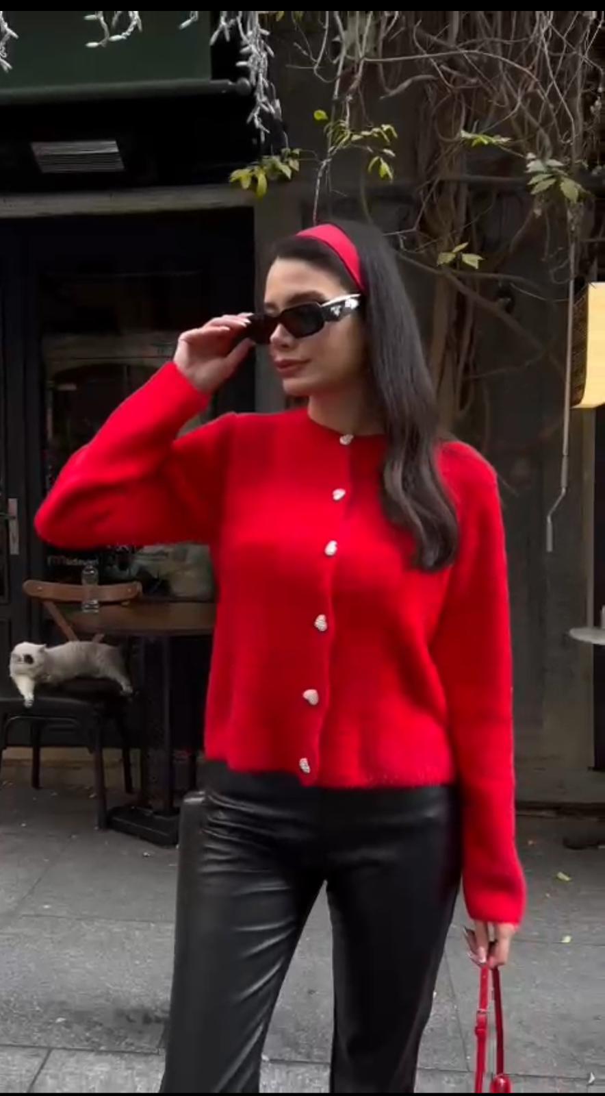 Yumuşak, Kalp Düğmeli Standart Beden Kırmızı Hırka