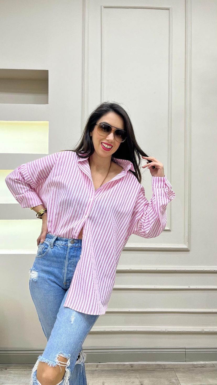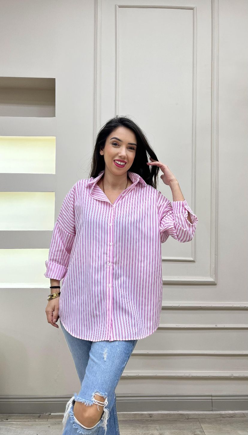 Gömleğin oversize kesimi, vücut hatlarını mükemmel bir şekilde vurgularken, aynı zamanda hareket özgürlüğü de sağlar. Çizgili tasarımı, klasik bir görünüm sunarken, pembe rengiyle günümüz modasına da uyum gösterir. Dilerseniz kot pantolonlarla birlikte günlük bir şıklık elde edebilir, dilerseniz bir etekle kombinleyerek ofis stiline sportif bir dokunuş katabilirsiniz.